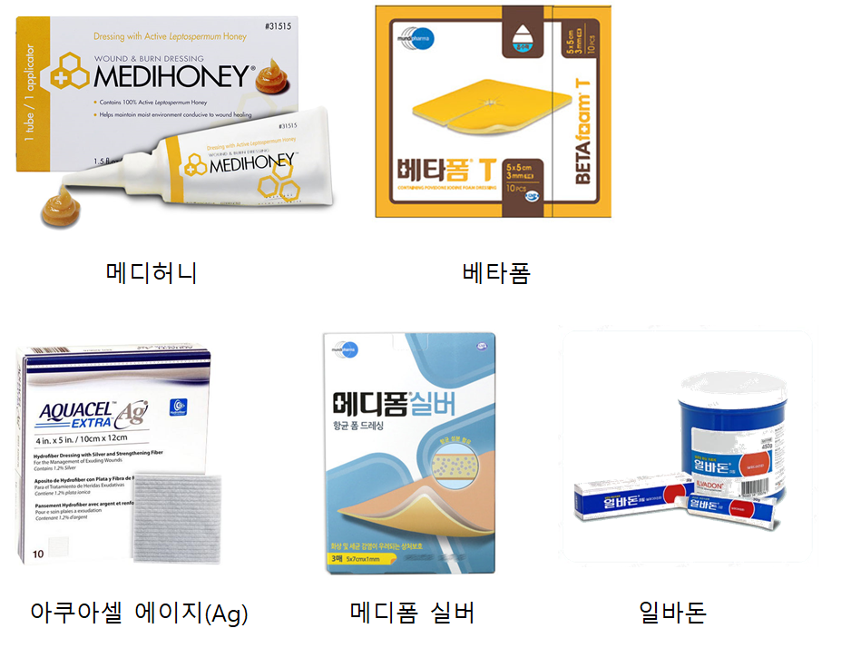 약제 또는 용액을 거즈, 스폰지 등과 결합시킨 드레싱제로 은, 요오드, 꿀 등과 결합한 제품들이 있습니다.