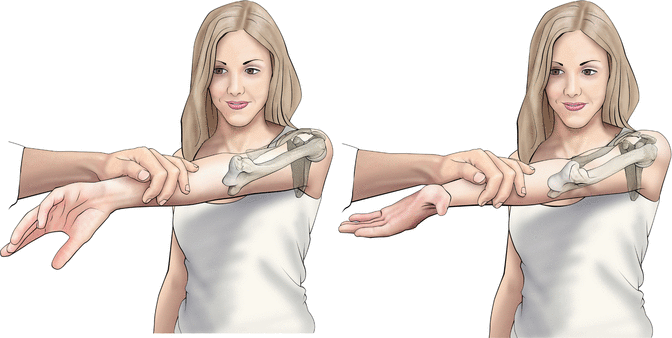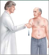 ① 환자가 앉거나 선 자세에서 팔꿈치를 완전히 신전 시킨 상태에서 검사합니다.