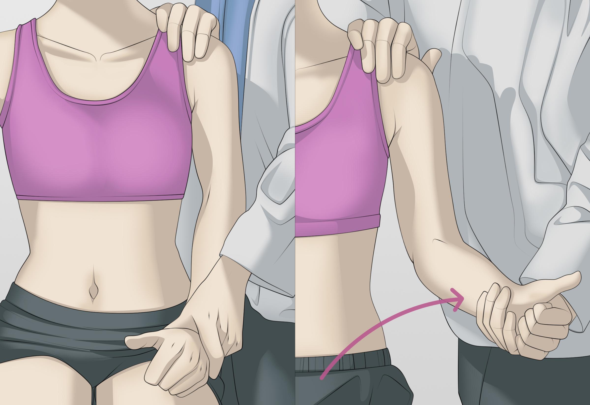 ② 검사자의 한쪽 손은 어깨 뒤쪽을 손바닥으로 감싸고, 다른 손으로 팔을 움직이도록 합니다.