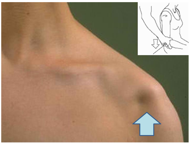 상완골 머리 부분과 견봉의 외측 사이에 손가락 1개 너비 이상의 피부 함몰을 Sulcus (구) 라고 하며, 이것이 나타나면 검사 양성입니다.
