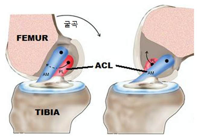 전방십자인대는 대퇴골의 외측과 (lateral condyle)의 내측면과 경골극 (tibial spine)의 전외측 사이를 연결하는 인대입니다. 크게 전내측 다발과 후외측 다발로 나눌 수 있으며, 무릎 굴곡시 후외측 다발이 느슨해지면서 전내측 다발 (AM) 은 단단해지고, 신전시 후외측 다발 (PL) 이 단단해지면서 전내측 다발은 이완됩니다.